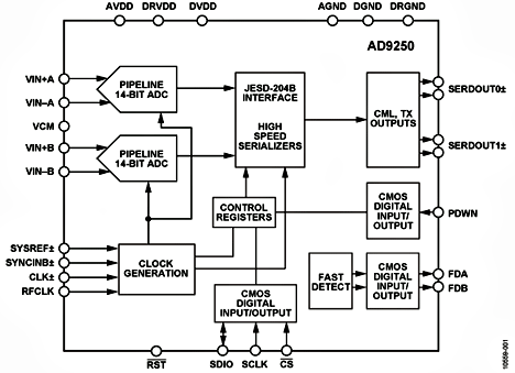 Analog Devices Inc выпустила компонент AD9250 – двухканальный 14-битный аналогово-цифровой преобразователь (АЦП) с частотой сэмплирования 250 млн. выборок в секунду и стандартом интерфейса последовательных данных JEDEC JESD204B.