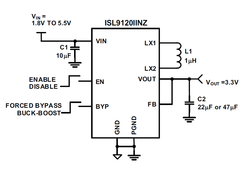 Стабилизатор ISL9120 исключает подобные проблемы, работая с более широким входным диапазоном напряжения и выдавая нужное усиление для того, чтобы избежать низковольтных сбоев. Для работы компонента с компактными размерами корпуса (1,41 х 1,41 мм) требуется лишь одна небольшая внешняя катушка.