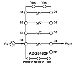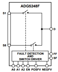 Согласно разработчикам, 4-канальный чип защиты ADG5462F, мультиплексор ADG5248F 8:1 и дифференциальный мультиплексор ADG5249F 4:1 могут быть задействованы в каскадах питания с возможным «горячим» переключением нагрузки и вероятными ошибками подключения для защиты остальной аналоговой части схемы.