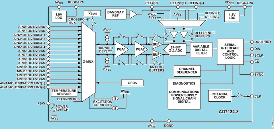 Компонент AD7124-4 имеет 4 дифференциальных и 7 псевдо-дифференциальных входов, компонент AD7124-8 оборудован 8 дифференциальными и 15 псевдо-дифференциальными входами. Модули аналогового сопряжения спроектированы для взаимодействия с устройствами, имеющими аналоговые выходы, например, с резистивными детекторами температуры, термопарами, токовыми/вольтажными входами и мостами.
