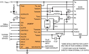 При использовании LTC2974 работоспособность системы определяется, исходя из регистров статуса напряжения, тока и температуры, в то время как мультиплексный 16-битный АЦП отслеживает напряжение на входе и выходе, выходной ток и температуру внешнего и внутреннего диодов.