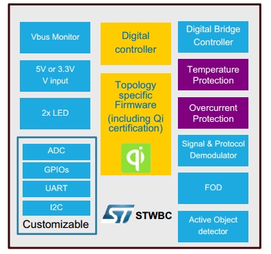 Чипсет состоит из контроллера передатчика энергии STWBC-WA и беспроводного приёмника STWLC04. Компоненты способны передать до 1 Вт мощности при использовании компактных источников питания: 11-мм батареи типа «монетка» в цепи приёмника и 20-мм – в цепи передатчика.