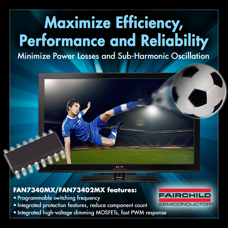 Fairchild Semiconductor выпустила компоненты FAN7340 и FAN73402 - одноканальные регуляторы усиления с интегрированными высоковольтными полевыми МОП-транзисторами для функции затемнения. Согласно разработчику, компоненты специально созданы для избавления от потерь мощности и субгармонических колебаний, помогая системным проектировщикам достичь большей производительности, эффективности и надёжности в мощных системах освещения, таких как светодиодная подсветка 3D-телевизоров и мониторов.
